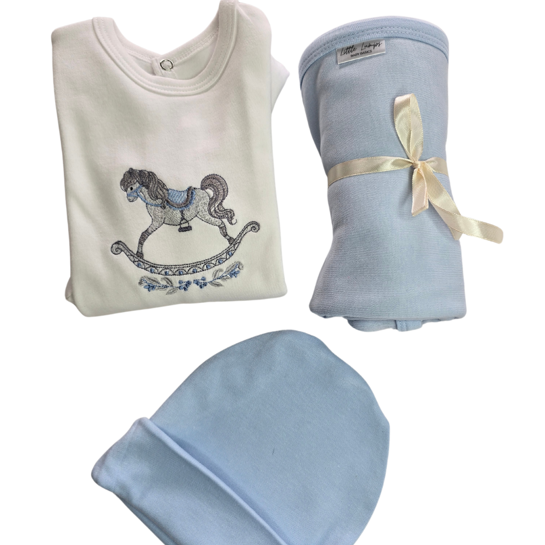 Welcome a little one into the world with our lovingly curated Rocking Horse Deluxe Baby Gift Set — a thoughtful collection of new-born essentials, beautifully presented in a charming, printed gift bag.